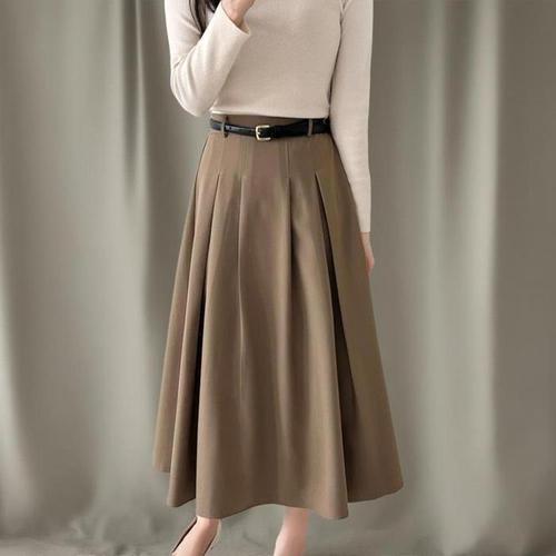 네모엔룩 롱핀턱플리츠 여성용 허리핀턱 주름A라인 벨트세트 롱 스커트. 스커트+벨트 총 2종