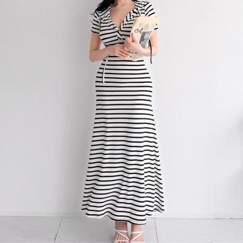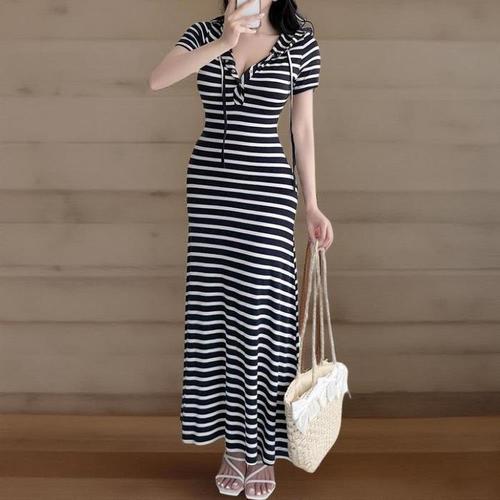 [신상오픈런]여자 캐주얼 스트라이프 단추 반팔 후드 롱 원피스 (39079199)