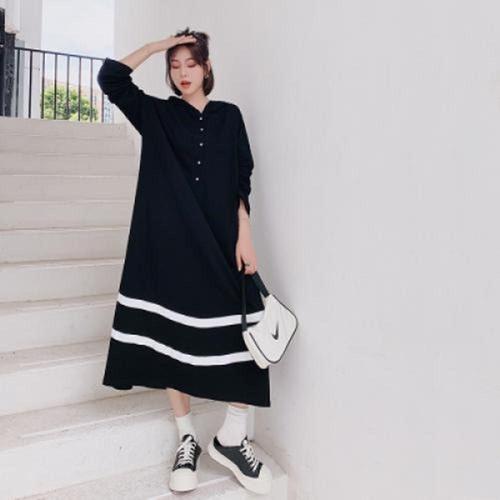 F00505 데일리 앞단추 루즈핏 긴팔 후드 롱 원피스 WFL8DJM