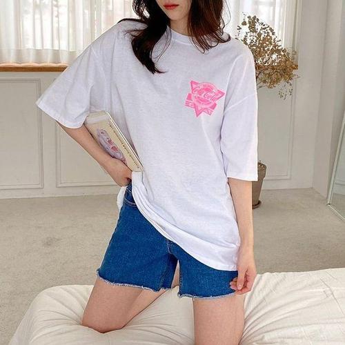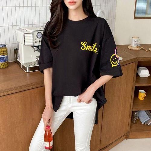 [에이치플러스몰]여성 루즈핏 스마일포인트 롱 반팔티 여름 데일리룩