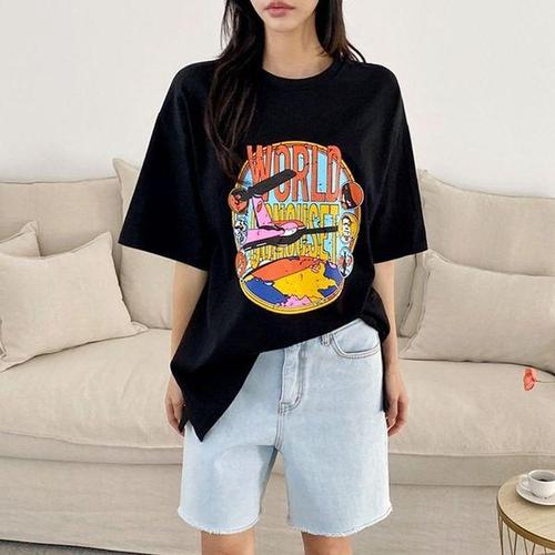 [에이치플러스몰]루즈핏 월드 반팔 롱 티셔츠