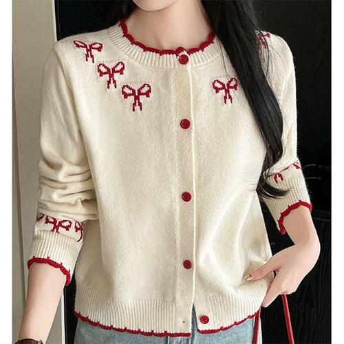 [패션시그널]리본패턴 라운드넥 니트가디건 79676F