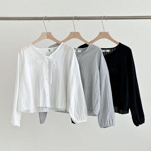 [옷자락]여성 리본넥 꽈배기 시스루 크롭 긴팔 코튼 블라우스