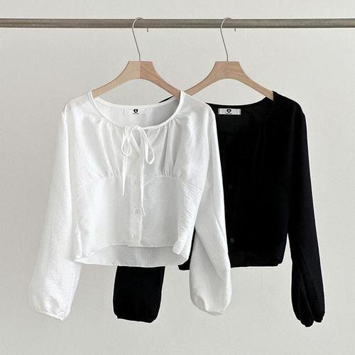 [옷자락] 여성 가을 리본넥 셔링 퍼프 긴팔 크롭 블라우스