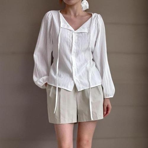 [옷자락]여성 가을 리본넥 셔링 퍼프 긴팔 크롭 블라우스