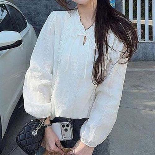 여성 레이스 리본 프릴 블라우스 긴팔