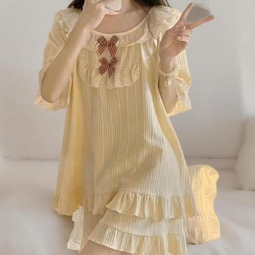 [신상오픈런]여성용 노란색 리본 프릴 반팔 상의와 반바지 파자마 세트