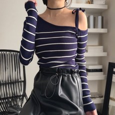 cammello 스트라이프 언발란스 리본 골지 니트 긴팔 니트티
