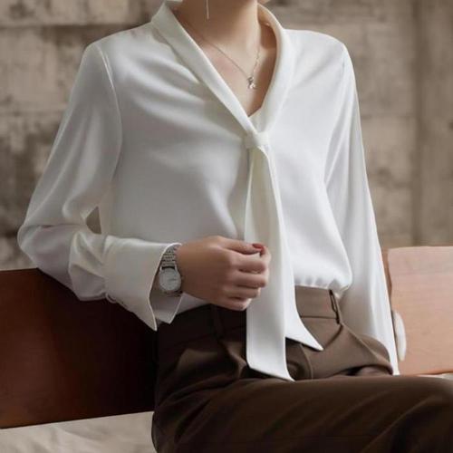 여성 봄가을 벌룬 소매 리본 장식 셔츠 데일리 통근 심플 컴포트 톱 슬림소녀