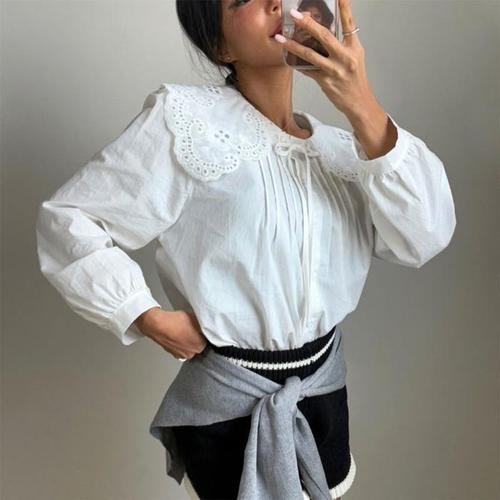 [신상오픈런]여성용 리본 장식 레이스 빅카라 루즈핏 박시 블라우스 셔츠 (41503184)