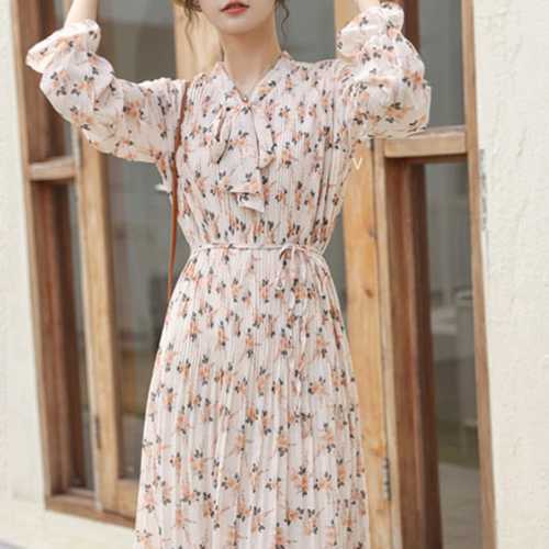 [모리스커밍홈] 리본넥 쉬폰나염 밑단주름 원피스_M2602OP604A