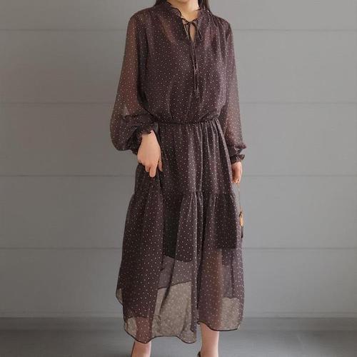 [신상오픈런]여성 가을 하객 원피스 시스루 쉬폰 리본 캉캉 도트 롱드레스 (40854921)