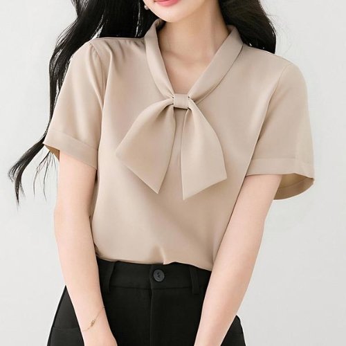 [핑크엘리제]리본 스카프 반팔 블라우스 엠버디블라우스