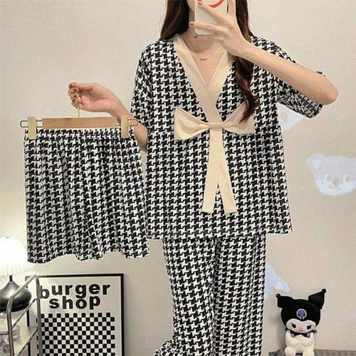 쉬블림로브 3피스(반팔+반바지+긴바지) 여성 홈웨어 리본 패턴 잠옷 세트 GGWD0486
