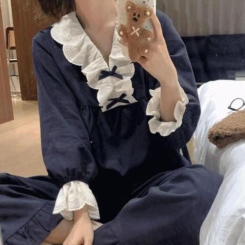 [셀러허브_여성트랜드패션]ONM 넥리본 파자마세트 여성 잠옷 레이스 간절기 봄