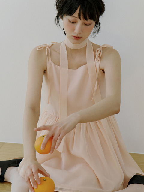 [리올그] 타이 셋업 리본 플레어 미니 원피스 크림 피치