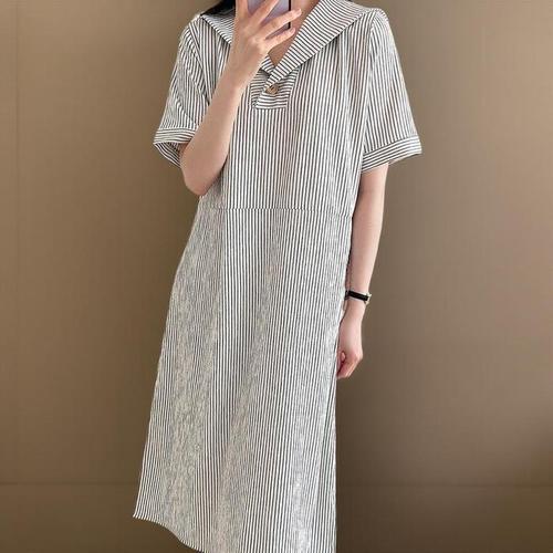 [신상오픈런]여성 리조트 스타일 스트라이프 셔츠카라 반팔 롱 드레스 (34574970)