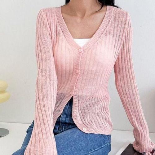 [에이치플러스몰]여성 린넨 골지 니트 가디건 1P 시스루 여자 카디건