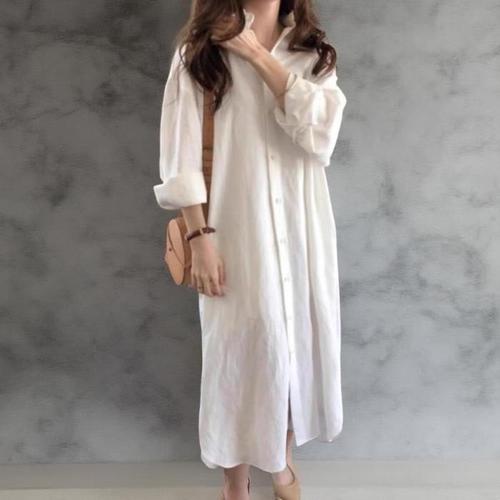 [옷자락]여성용 부드러운 린넨 카라 셔츠 롱드레스