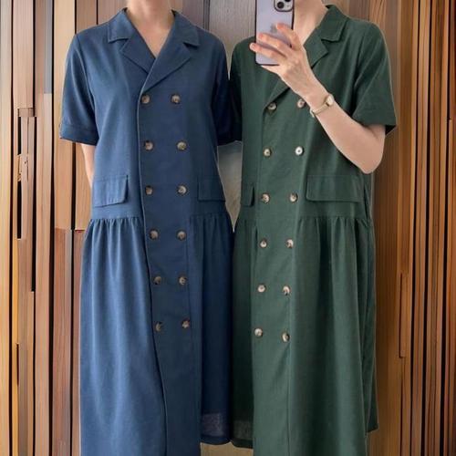 [신상오픈런]여성 린넨 반팔 롱 원피스 더블버튼 카라넥 핀턱 디자인 (32966091)