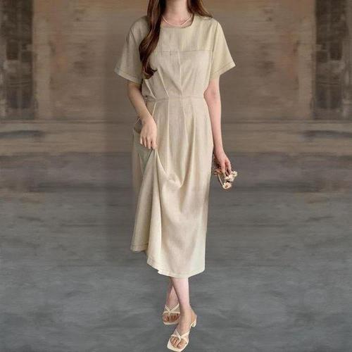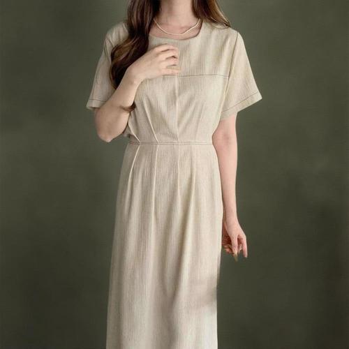 [옷자락]여성 클래식 린넨 핀턱 절개 반팔 a라인 롱 원피스