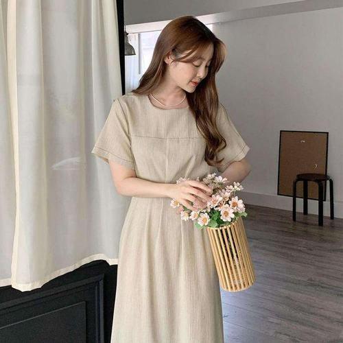 일본수출용 린넨원피스 프렌치 핀턱 라운드넥 반소매 여름 원피스 편안한 휴양지룩 빅사이즈 오버핏