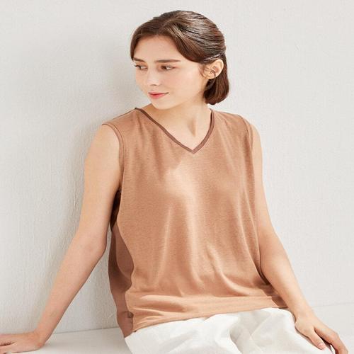 [샵앤]국산 여성 린넨 V넥 무지 베이직 민소매 나시티 SML-WSH-4588-브라운