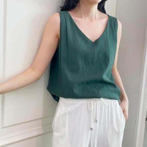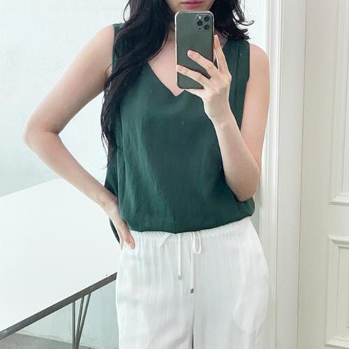 [샵앤][샵앤] 국산 여성 린넨 V넥 무지 베이직 민소매 나시티 SML-WSH-4588-그린