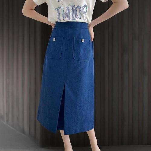 [신상오픈런]여자 파랑색치마 앞트임 투포켓 여름 린넨 롱스커트 (39079169)