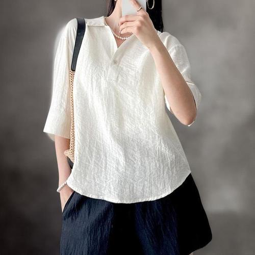 [신상오픈런]여성용 브이넥 린넨 7부 프릴 블라우스 클래식 스타일 (35834883)