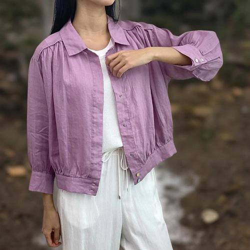 [신상오픈런]여성 린넨 스냅 버튼 핀턱 셔링 카라넥 7부 자켓 (35836012)