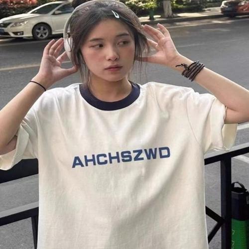 [엄지척]여성 링거 오버핏 레터링 라운드넥 배색 반팔티셔츠_19615337_667501