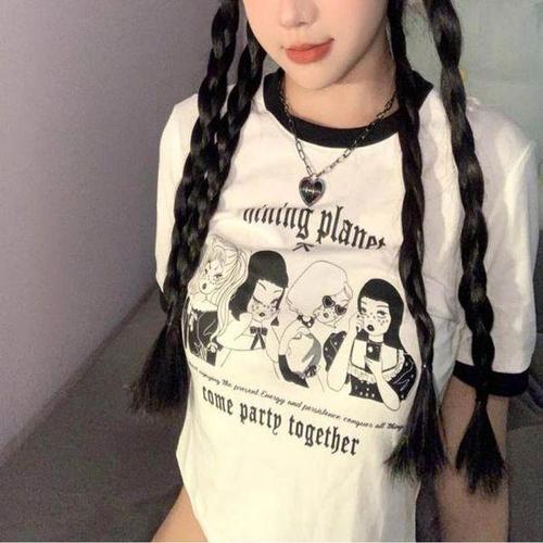 [셀러허브_여성트랜드패션]여자 배색 크롭 반팔티 상의 링거티 프린팅 여름