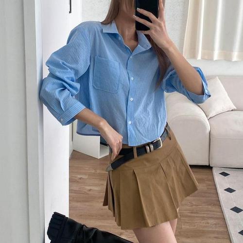 [신상오픈런]스트라이프셔츠 잔줄 여성 크롭 긴팔 린넨 마남방 (31642509)