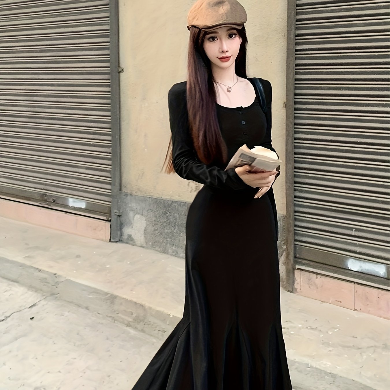 TEMU 여성용 우아한 블랙 포멀 & 데일리 맥시 드레스 - 긴소매 A라인 실루엣, 스퀘어 넥라인, 파티, 사무실, 캐주얼 의상에 어울리는 핏 - 올 시즌 시크 이브닝 가운, 파티 복장, 세련된 스타일, 고품질 스티칭, A라인 원피스, 원피스, 여름 원피스, 여성 원피스, 가을 원피스, 긴소매 원피스