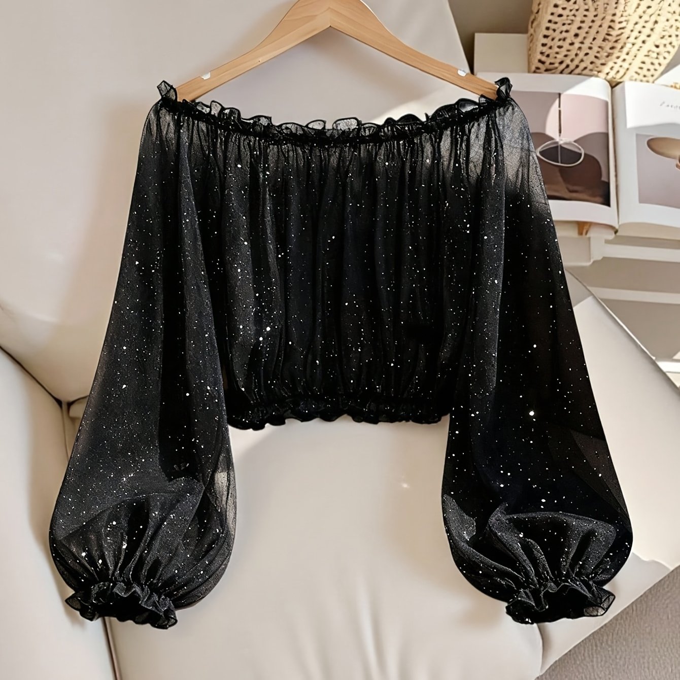 TEMU 여성용 신상 봄 패션 스팽글 원숄더 오프숄더 랜턴 슬리브 캐주얼 크롭 탑
