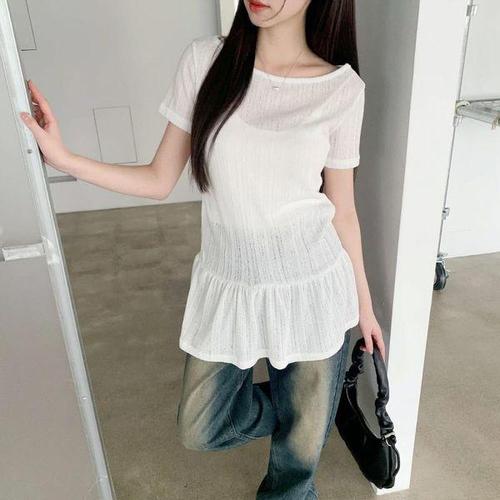 [다잇템]여성 프릴 망사 반소매 롱 비침 코디 니트