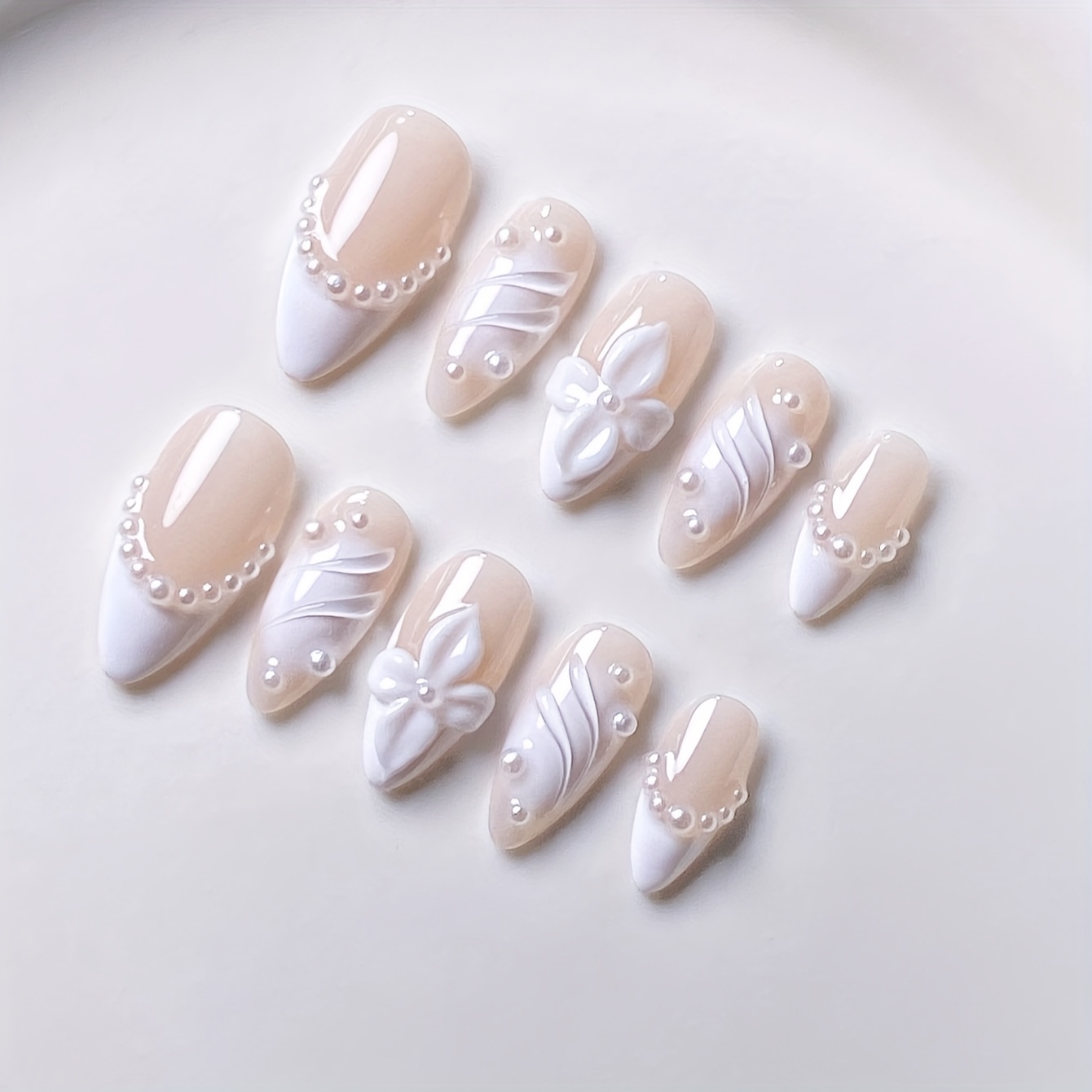 TEMU 10개입 수제 프렌치 매니큐어 프레스온 네일 - 우아한 화이트 & 크리미 - 아몬드형 미디엄 길이 플라워 디자인 & 라인 장식 - 광택 마감 럭셔리 네일 연장 (웨딩, 파티, 일상용) - 홈 어플리케이션, 네일 액세서리, 특별한 날, 디테일한 장식, 뷰티 애호가, 섬세한 장식, 패션 애호가