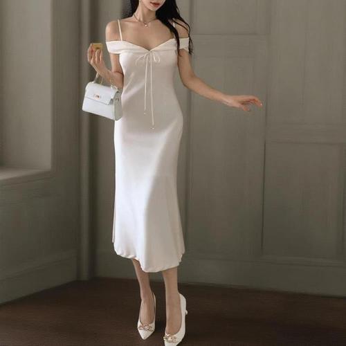 [신상오픈런]여성용 오프숄더 롱원피스 가을 머메이드 스타일 리본 장식 스몰웨딩용 (41503015)