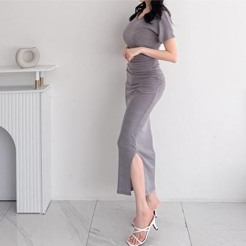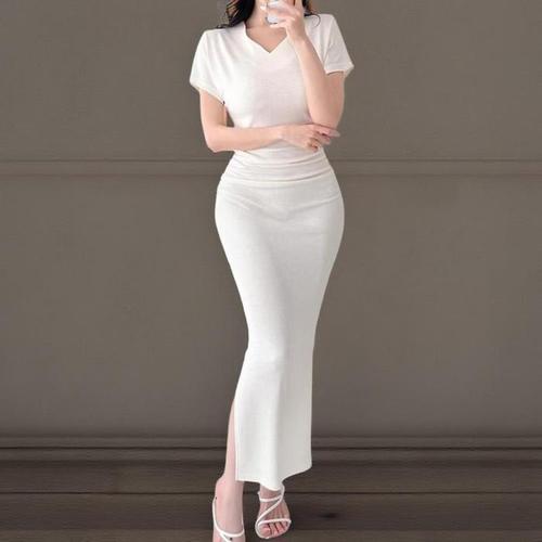 [신상오픈런]여성 브이넥 숏슬리브 셔링 머메이드 슬릿 롱드레스 (37709915)