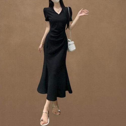 [신상오픈런]여성 브이넥 반팔 셔링 머메이드 롱 드레스 트임 (37709889)