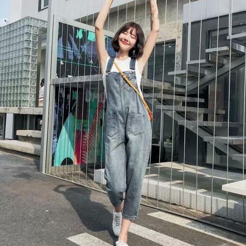 여성 외출 여행 피크닉 스타일 귀여운 데님 멜빵 팬츠
