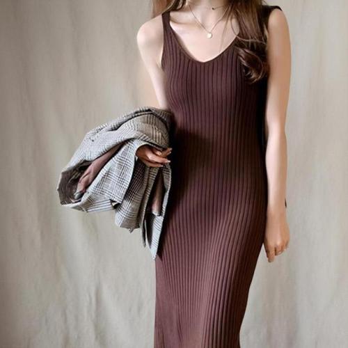 [신상오픈런]여성 슬림핏 골지 면 혼합 트임 나시 롱 드레스 (38767283)
