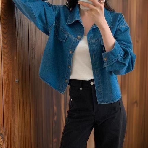 [신상오픈런]여성 탄탄한 코튼 백라벨 짙은 청색 카라넥 세미크롭 청자켓 (33138628)