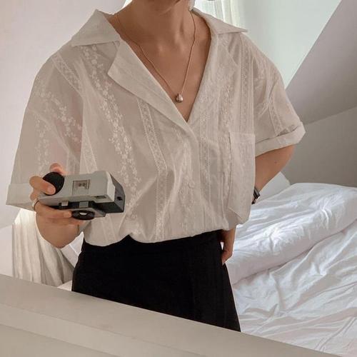 [신상오픈런]여성용 꽃무늬 레이스 포켓 대형 카라 반팔 면 블라우스 (39101982)