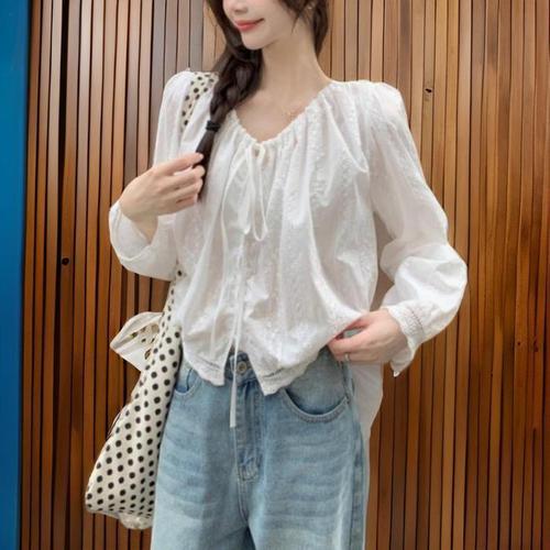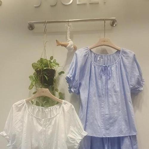 [신상오픈런]여성 반소매 끈 디테일 크림색 면 반팔 블라우스 (32966482)