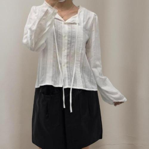 [신상오픈런]여성 심플 코튼 핀턱 프릴 스트랩 롱슬리브 블라우스