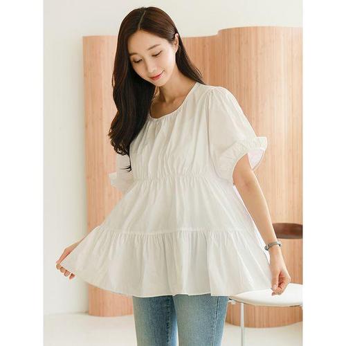 [옷자락] 여성용 코튼 소매밴드 프릴 무지 블라우스 티셔츠