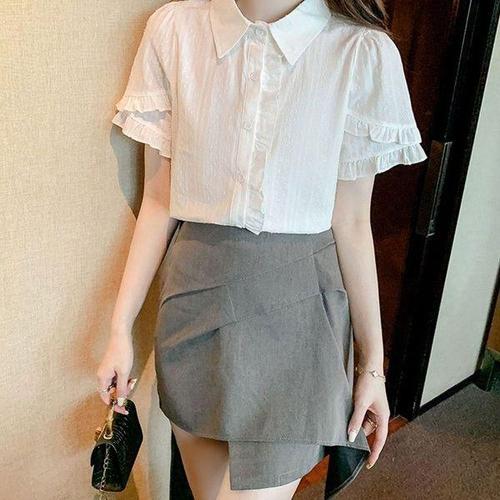 [에이치플러스몰]화이트 프릴 이중소매 여성 반팔 블라우스 여름 코튼