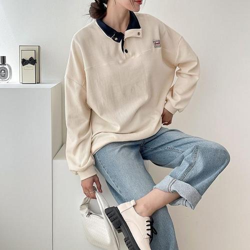 [신상오픈런]여성 오버사이즈 긴팔 티셔츠 패치 디자인 버튼 배색 반목 가을 스타일 맨투맨 (40724215)